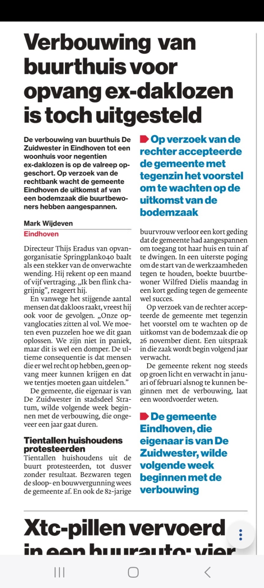 • De zitting van de omgevingsvergunning (over het project) staat gepland 26 november. Dit betekent dat er tussen het beginnen van de bouw en deze rechtszaak maar enkele weken zitten. De rechter vroeg aan de gemeente waarom zij niet 4 weken kan afwachten i.v.m. met alle komende procedures. Hierop werd geen duidelijke reden gegeven. Vervolgens heeft de gemeente met tegenin hierin moeten instemmen.